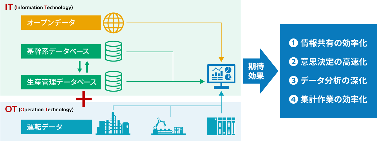 OT領域の運転データと、IT領域の生産管理データ・基幹データを組み合わせることで、情報共有の効率化、集計作業の効率化、意思決定の高速化、データ分析の深化といった効果を生み出します。