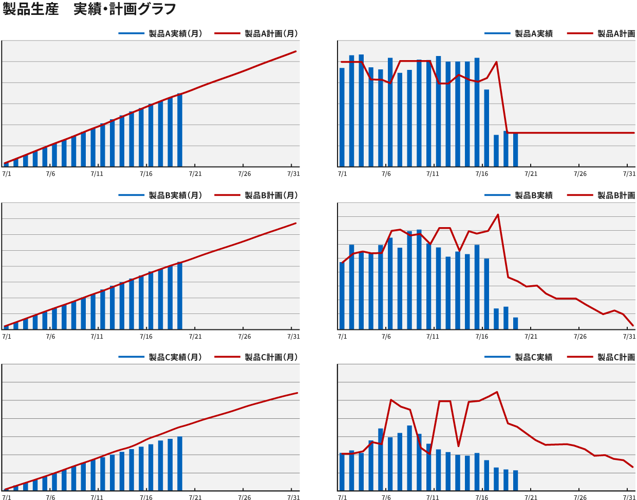生産計画に対応する実績値を自動で収集し、グラフ化することで、これまでデータ収集にかかっていた工数を削減。計画実績差異の、早期検知が可能に。